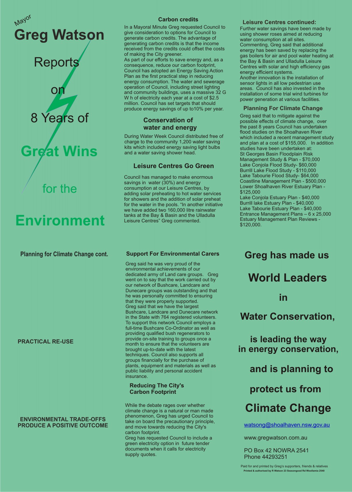 These studies have partly been funded by State Government Grants of $2 million and Council's revenue stream. Greg said that some people questioned the wisdom of undertaking these studies but he said it was absolutely essential that we have a proper understanding of the risk to our urban areas and farmlands should the forecast of dramatic climate change eventuate. In addition to assessing possible effects of climate these studies are also necessary to determine appropriate safe floor levels for new development, which includes residential dwellings.